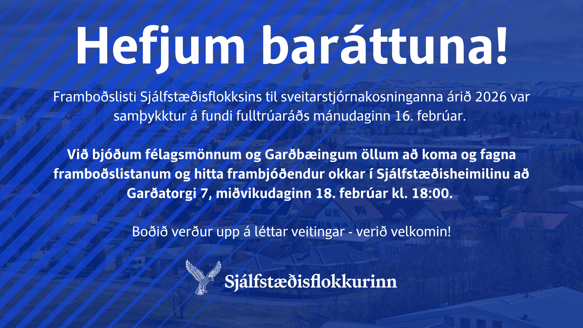 Við bjóðum félagsmönnum og Garðbæingum öllum að koma og fagna framboðslistanum og hitta frambjóðendur okkar í Sjálfstæðisheimilinu að Garðatorgi 7, miðvikudaginn 18. febrúar kl. 18:00.